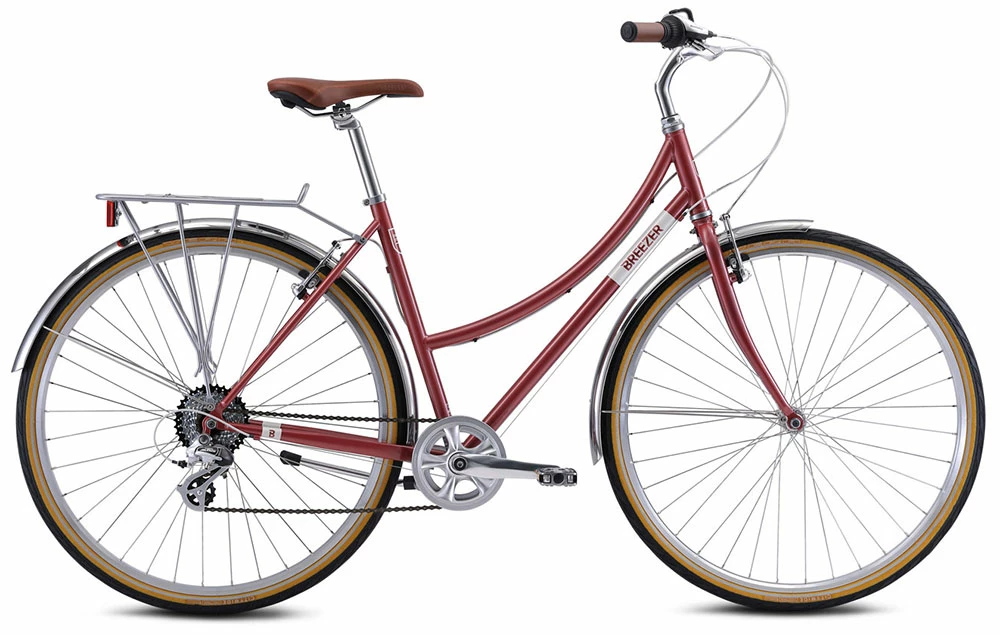 The Downtown is Breezer’s classic chromoly steel town bike: 700C wheels, equipped with matching fenders and chainguard, rear rack, kickstand, and bell.