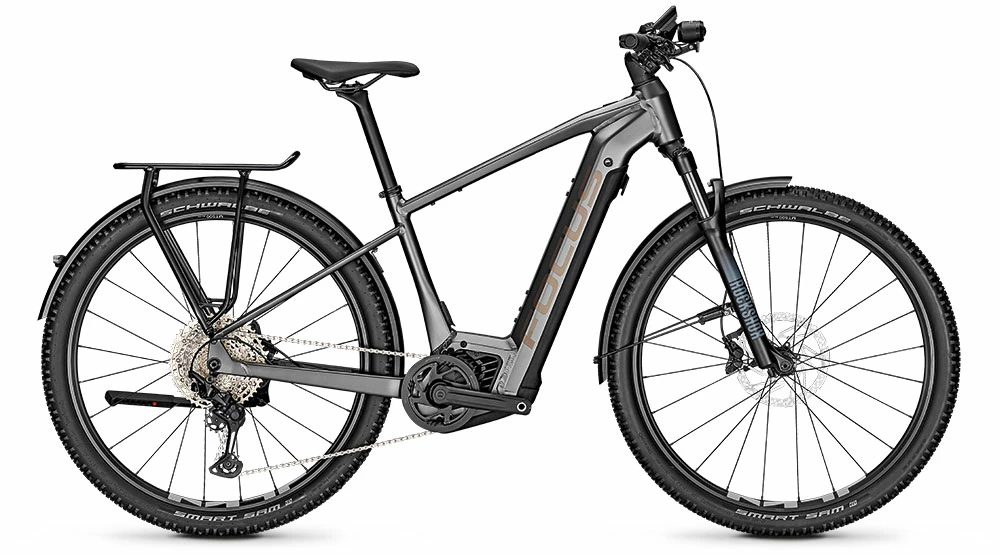 The FOCUS AVENTURA² with powerful Bosch Performance CX Smart E-drive offers a peak range of 750 Wh. The battery sits beautifully integrated in the down tube, but can be removed for charging. With luggage rack, mudguards, stand and light, the world is open to you, thanks to 100 mm suspension fork and mountain bike tires it also goes far beyond the city limits.