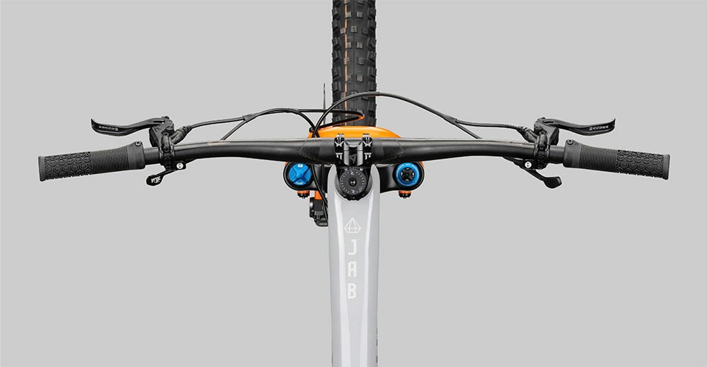 The basis for the trail fun is the very light JAB full carbon frame with about 2,200 grams of frame weight, which includes all modern technical standards and gives you the possibility of geometry adjustment by means of a FlipChip. At the rear, the JAB frame generates 160 mm of travel over the top air shock Fox Float X2 Factory, which you can harden with the 2 position lever lightning fast for long and steep climbs in the compression. In the open position, on the other hand, it generates plenty of ground contact and gives you plenty of reserve for when the going gets rough. A perfect complement to the front is the Fox Float 38 Factory fork with Grip2 cartridge and 170 mm of travel and multiple adjustment options .You can adjust the rebound and compression separately here in low and high speed. The perfectly balanced suspension, tuned to the JAB, is guaranteed fun and life insurance in one when the going gets tough – and with the shimmering golden, finely responsive Kashima coating, it’s also a real eye-catcher in front of the trendy ice cream parlor. To achieve maximum range in gear ratios, we mount a SRAM X01 Eagle gear system with enormous gear spread through the 10-52 tooth cassette. So you can conquer any steep climb and still have enough pressure on the downhill, all with only one chainring in front. If the speed gets too high for you, you have a real anchor on board with the brutally strong Magura MT7 disk brake with its four-piston calipers in the front and rear, which you can throw, but in a very controlled way. You also keep control at all times with the top ergonomic, short-wide RaceFace Turbine R cockpit and the silky smooth Fox Transfer Dropper Post, which is lowerable from the handlebars, which shimmers in Kashima gold similar to the suspension. For the extended enduro round, we specify the lightweight as well as stable Newmen SL A.30 wheelset, which provides you with perfect support for a fast start as well as in hard terrain. For wild trail interludes, the tire combination of Schwalbe’s Magic Mary and Big Betty in the soft variant is ideal. Maximum grip is part of the DNA here. Go ballistic with JAB 10.0 HD!
