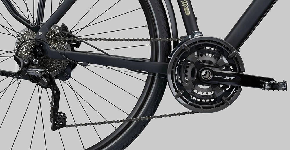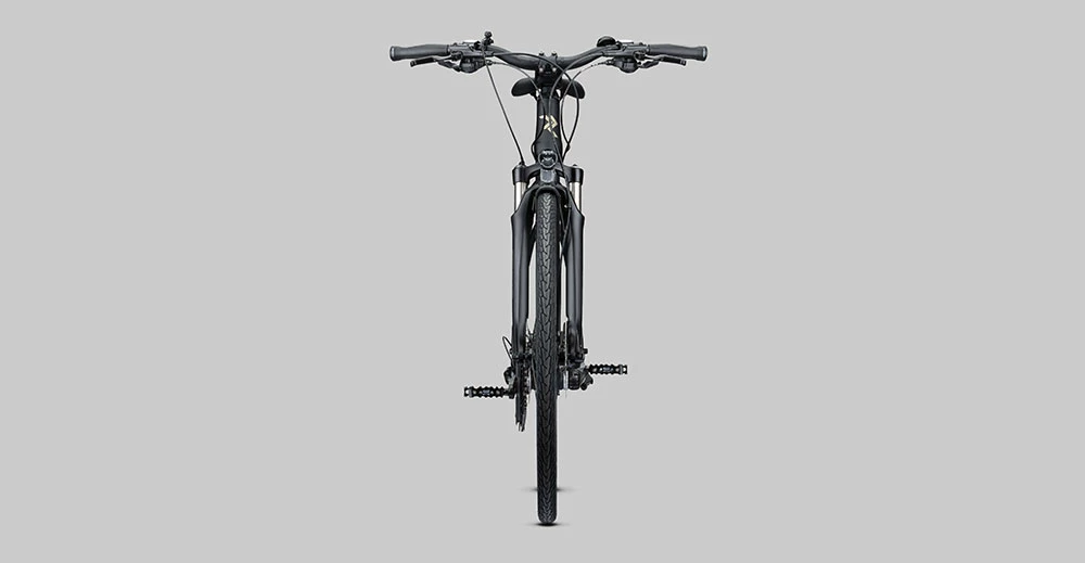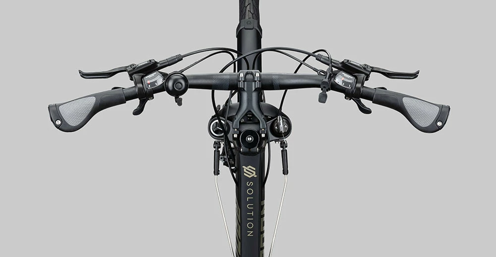 The combination of a torsionally stiff aluminium frame with high-quality parts creates a well thought-out bike that offers the owner a lot of riding fun with very high reliability. The overall package includes comfort and service with an adjustable and lockable Suntour NCX-D RL suspension fork, ergonomic grips and saddle by Ergon and smooth-running Schwalbe Road Cruiser tyres. The SOLUTIONS’ good performance is guaranteed by the sophisticated and precise Shimano 3×10 drivetrain, which, with components from the XT and DEORE series, ensures feather-light gear changes and the best gear ratios. Riding safety and control result from the hydraulic Shimano BR-MT200 brakes, which are operated from the height- and length-adjustable cockpit. Nothing stands in the way of year-round use in all weathers with the elegantly integrated mudguard/baggage rack combination and the super-bright, hub dynamo-powered Busch & Müller lighting system.